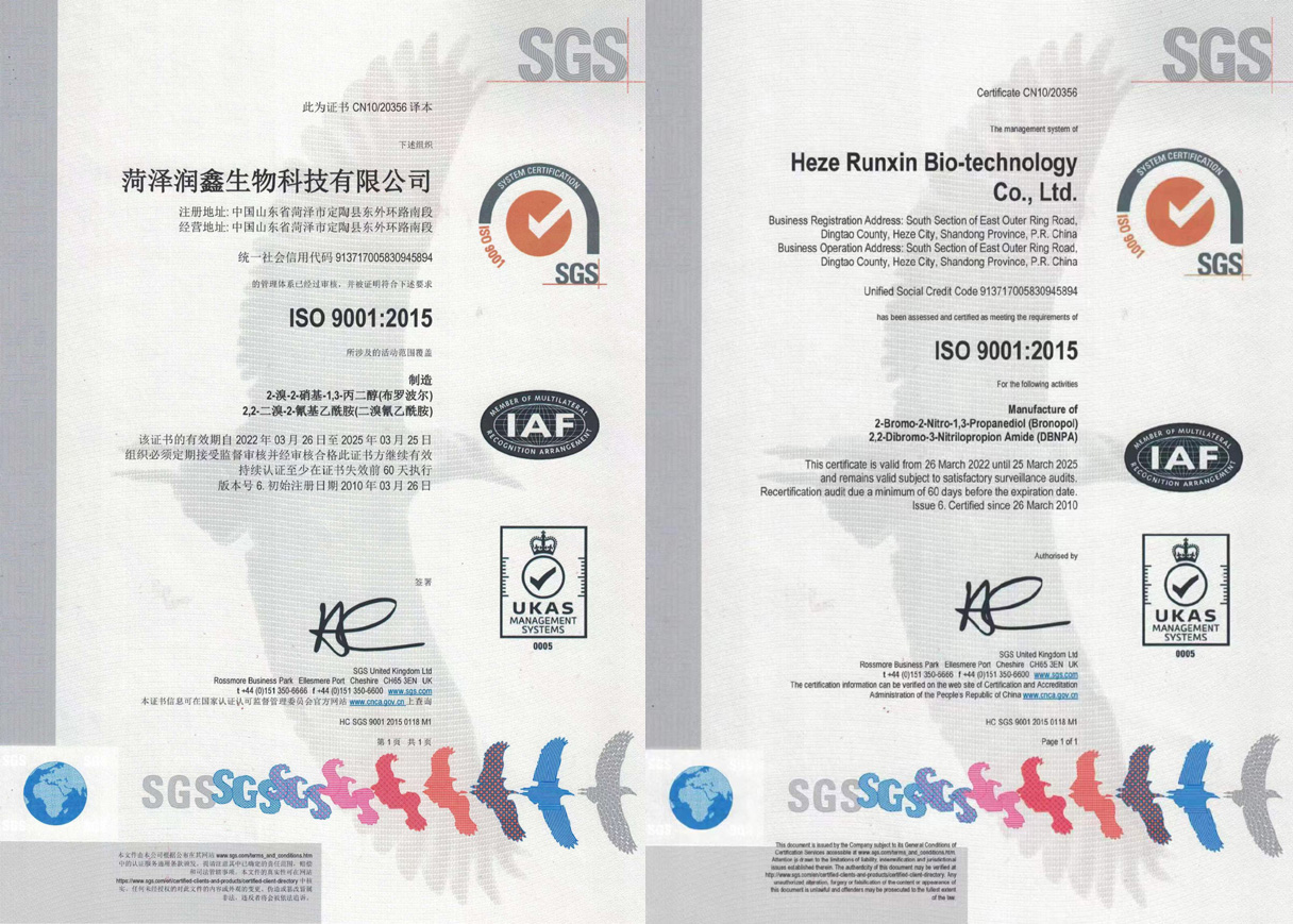工廠自2002年開始生產工業(yè)殺菌防腐劑、水處理化學品、醫(yī)藥中間體。殺菌劑系列產品主要有二溴氰乙酰胺(又名DBNPA)、溴硝醇(又名布羅波爾)等,醫(yī)藥中間體有氰乙酰胺及甾體激素類產品,同時供應食品添加劑和動物保護產品。工廠于2005年通過ISO質量體系認證,擁有完整的生產線,液相、氣相等完備的檢測設備,實行嚴格的質量控制,產品深受客戶認可。